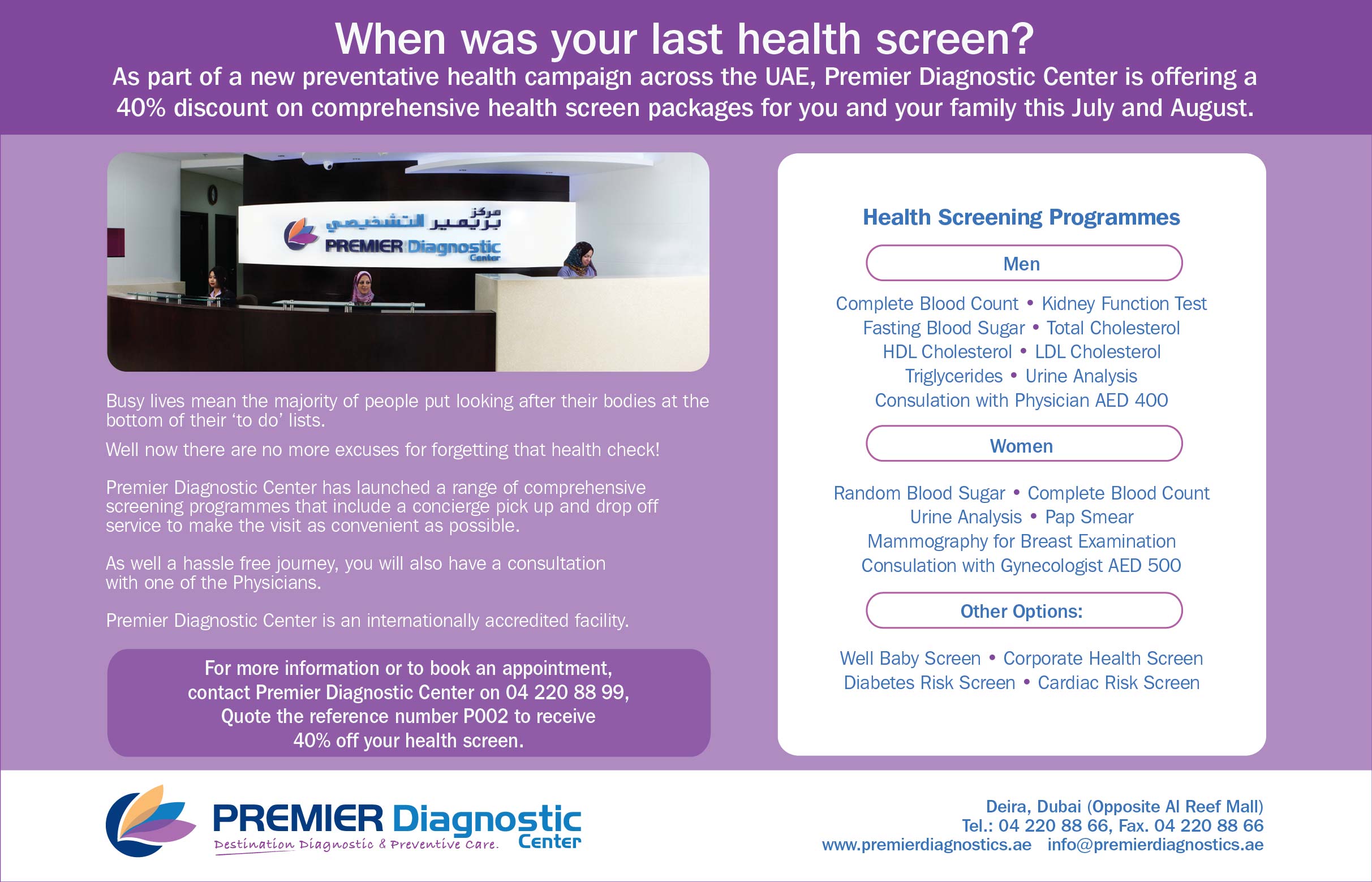 Health conscious residents of Dubai will have the same professional and quality Preventive Health Check up facilities at Premier Diagnostic Center for men and women ranging from basic to comprehensive packages for which they generally travel to Europe, Thailand and India.